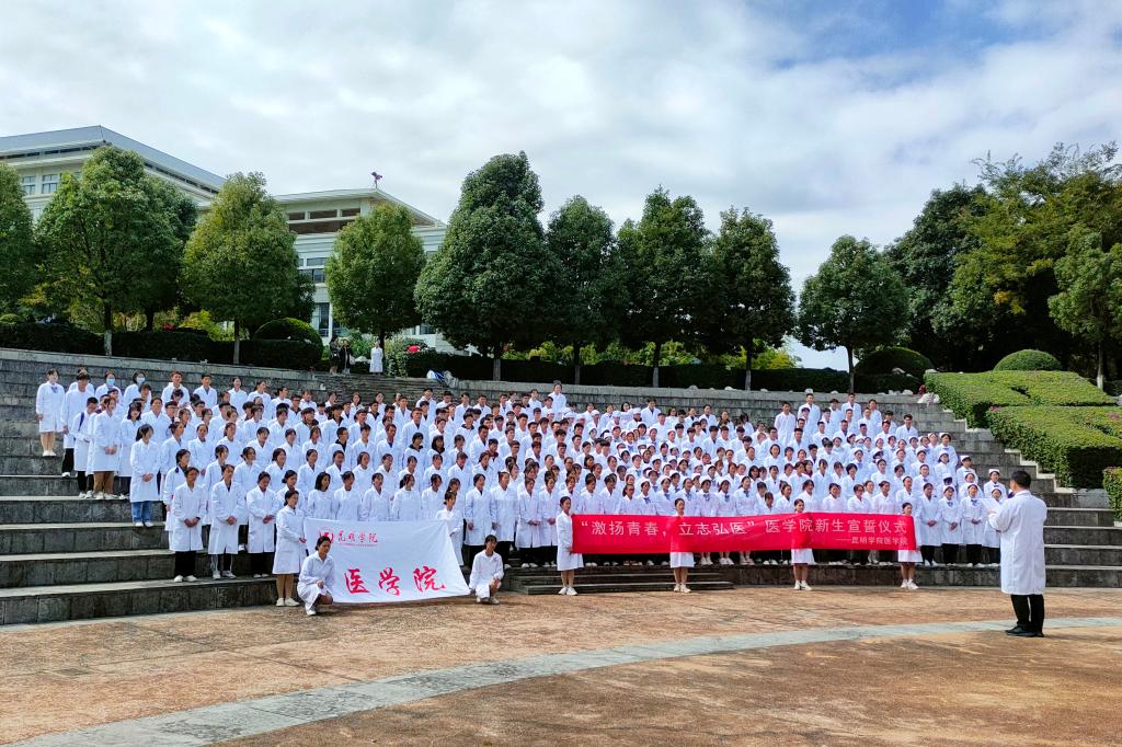 2023年10月20日中午,威廉希尔williamhill中文在公司听心湖广场举行“激扬青春,立志弘医”主题2023级新生医员工誓词宣誓仪式,公司领导班子、新生班班主任、辅导员、团学干部、全体新生参加。