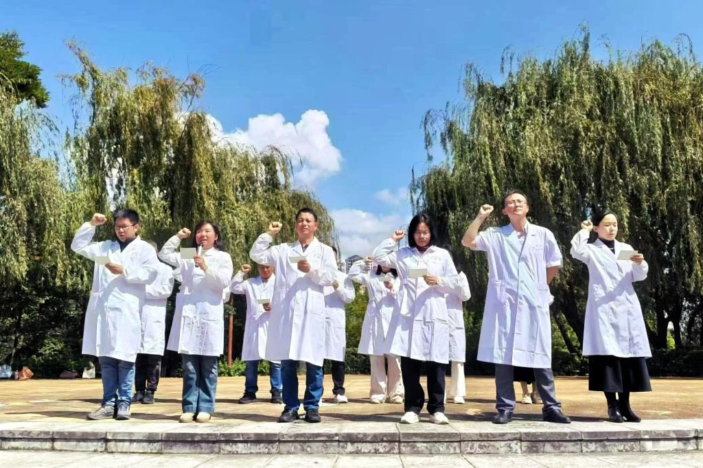 在宣誓仪式现场,全体师生身着白衣,队列井然,右手握拳,在李凯佳副书记的带领下,以无比庄重与神圣的姿态齐声宣誓:“健康所系,性命相托……”。字字铿锵,句句深情,不仅展现了医员工们对医学事业的无畏敬仰,更彰显了他们对宝贵生命的深切尊重。